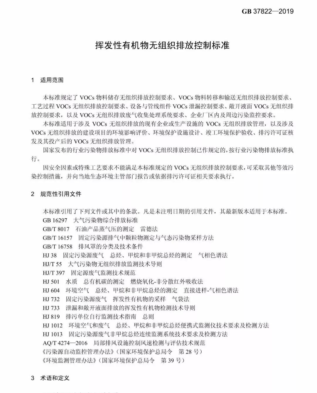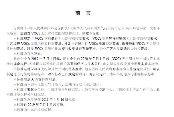 為貫徹《中華人民共和國環境保護法》《中華人民共和國大氣污染防治法》,防治環境污染,改善環境質量,加強對 VOCs 無組織排放的控制和管理,制定本標準。本標準規定了 VOCs 物料儲存無組織排放控制要求、VOCs 物料轉移和輸送無組織排放控制要求、工藝過程 VOCs 無組織排放控制要求、設備與管線組件 VOCs 泄漏控制要求、敞開液面 VOCs 無組織排放控制要求,以及 VOCs 無組織排放廢氣收集處理系統要求、企業廠區內及周邊污染監控要求。本標準為首次發布。