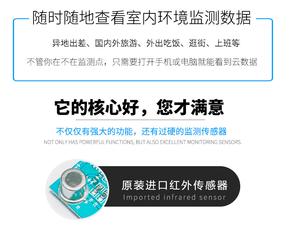 AIFLI-LCD200室內專用環境檢 監測系統終端-壁掛式是一款專門針對家居及公共場所室內環境而定制全面24小時實時在線監測的系統終端設備,可以在手機端、電腦端遠程查看相關監測數據。