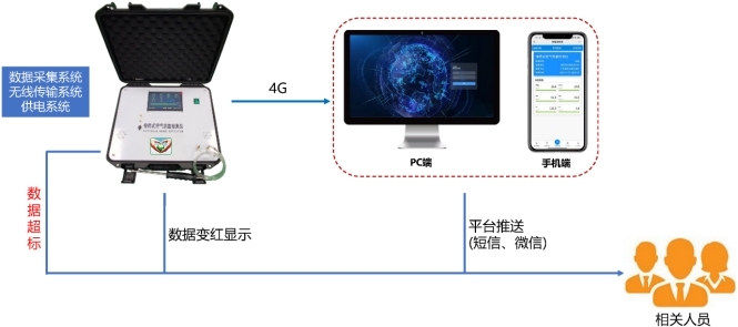 設備選配GPS定位系統,可放置汽車內增加氣路軟管長度,將采樣手柄放置車外進行走航監測,上傳頻率可達5秒/次。采用4G網絡通訊技術,通過運營商提供無線基站接入互聯網進行數據上傳,(可通過PC端、手機公眾號、APP進行數據查看與分析),加密數據傳輸,保證安全、穩定、快捷。