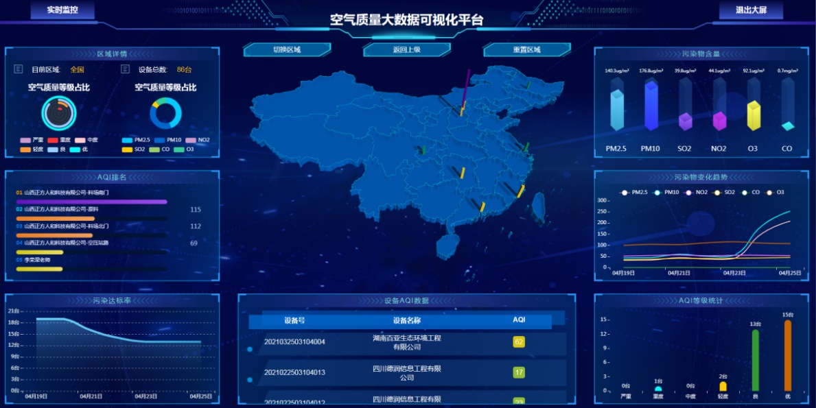 空氣質量監測云平臺(以下簡稱云平臺),通過現場端設備對空氣質量數據進行實時監測,并將監測數據在軟件系統進行質控、分析以及應用。數據詳情可進行多元化展示,智能分析比對,生成分析報表;結合大數據分析模型,由點及面,網格化全面覆蓋,實現污染溯源,趨勢預測,同時,具備數據監管大屏,直觀呈現數據變化動態,充分滿足監管單位的監測需求。
